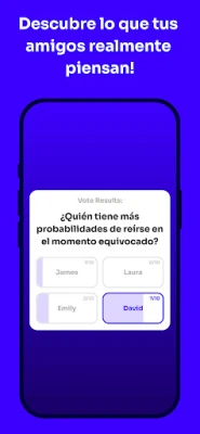 Boomit Party es la clave para diversión sin fin con amigos. Transforma cualquier reunión en una fiesta inolvidable con preguntas "¿Quién es más probable que...?" y juegos explosivos. Descubre secretos graciosos y ríe a carcajadas con cada partida.